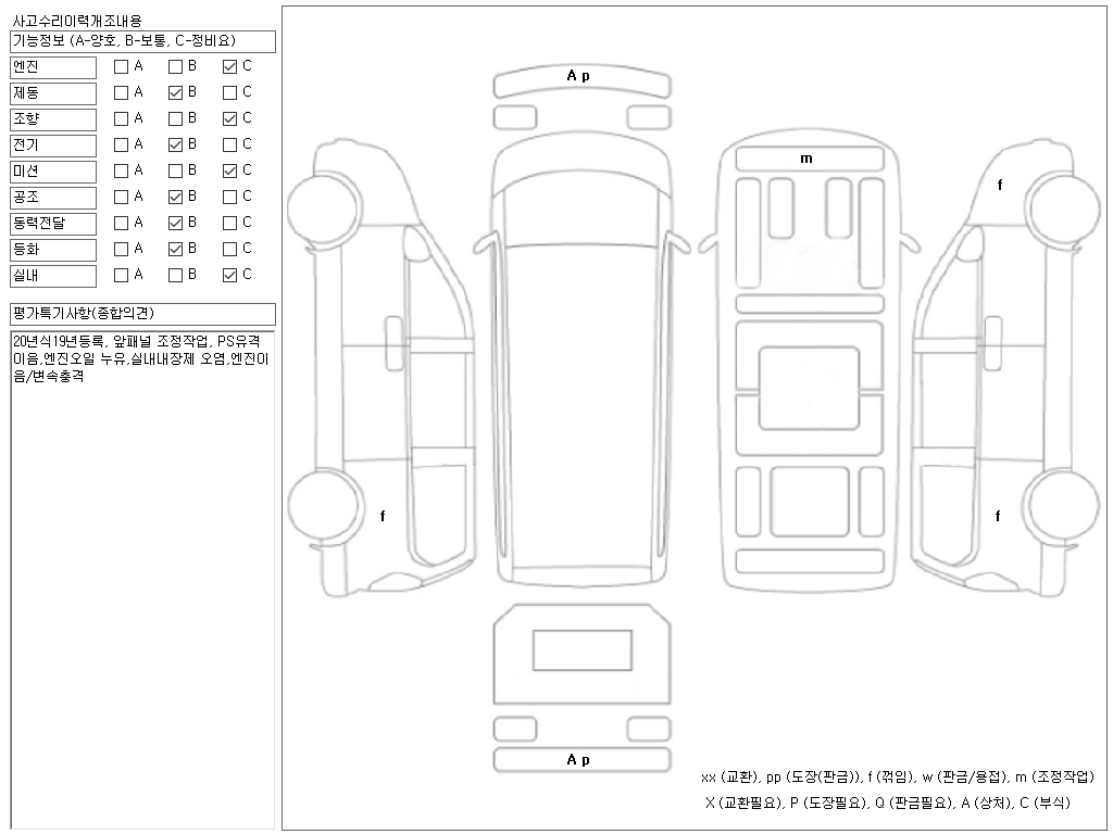 20년식19년등록, 앞패널 조정작업, PS유격이음,엔진오일 누유,실내내장제 오염,엔진이음/변속충격