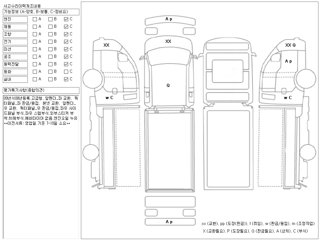 09년식08년등록,고급형, 앞펜더_좌 교환, 쿼터패널_좌 판금/용접, 본넷 교환, 앞펜더_우 교환, 쿼터패널_우 판금/용접,좌우 사이드패널 부식,좌우 스텝부식,외부스티커 부착,하체부식,예비타이어 없음,엔진오일 누유 **이전서류: 영업일 기준 7-10일 소요** ,