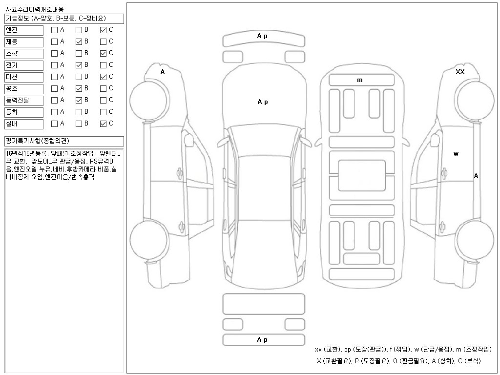 16년식15년등록, 앞패널 조정작업, 앞펜더_우 교환, 앞도어_우 판금/용접, PS유격이음,엔진오일 누유,네비.후방카메라 비품,실내내장제 오염,엔진이음/변속충격, ,