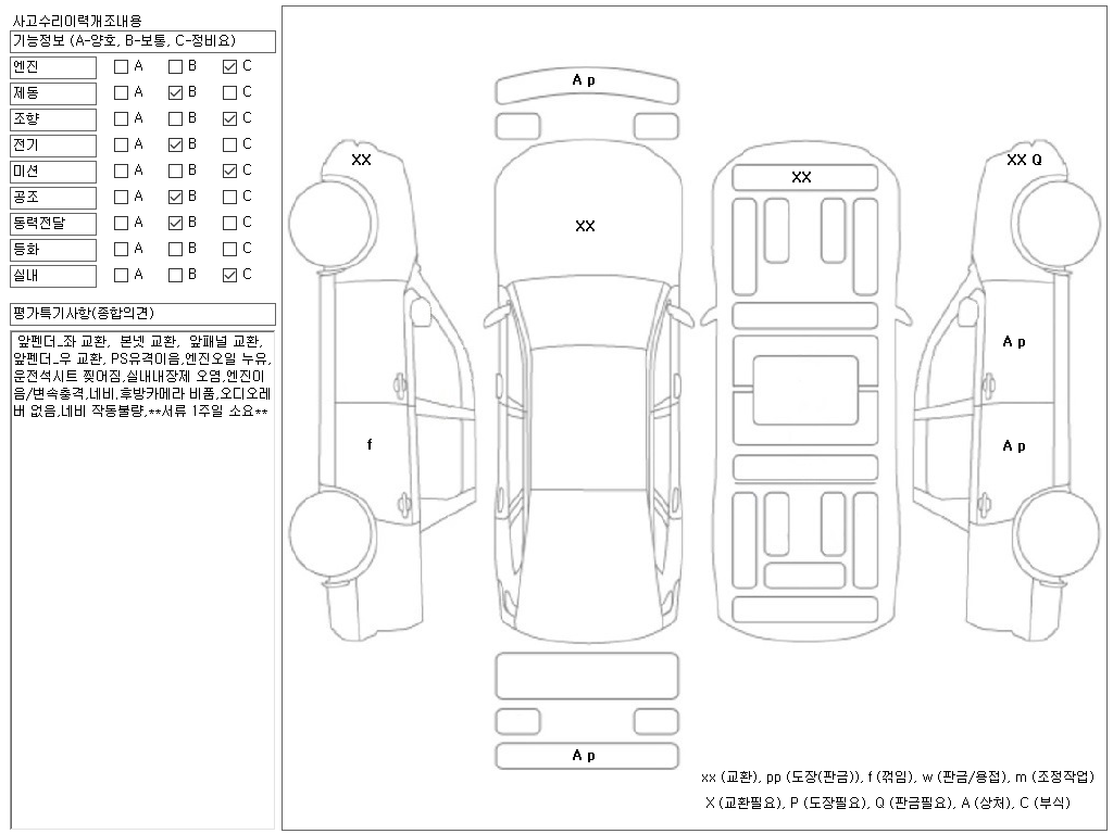 앞펜더_좌 교환, 본넷 교환, 앞패널 교환, 앞펜더_우 교환, PS유격이음,엔진오일 누유,운전석시트 찢어짐,실내내장제 오염,엔진이음/변속충격,네비.후방카메라 비품,오디오레버 없음,네비 작동불량,**서류 1주일 소요**,
